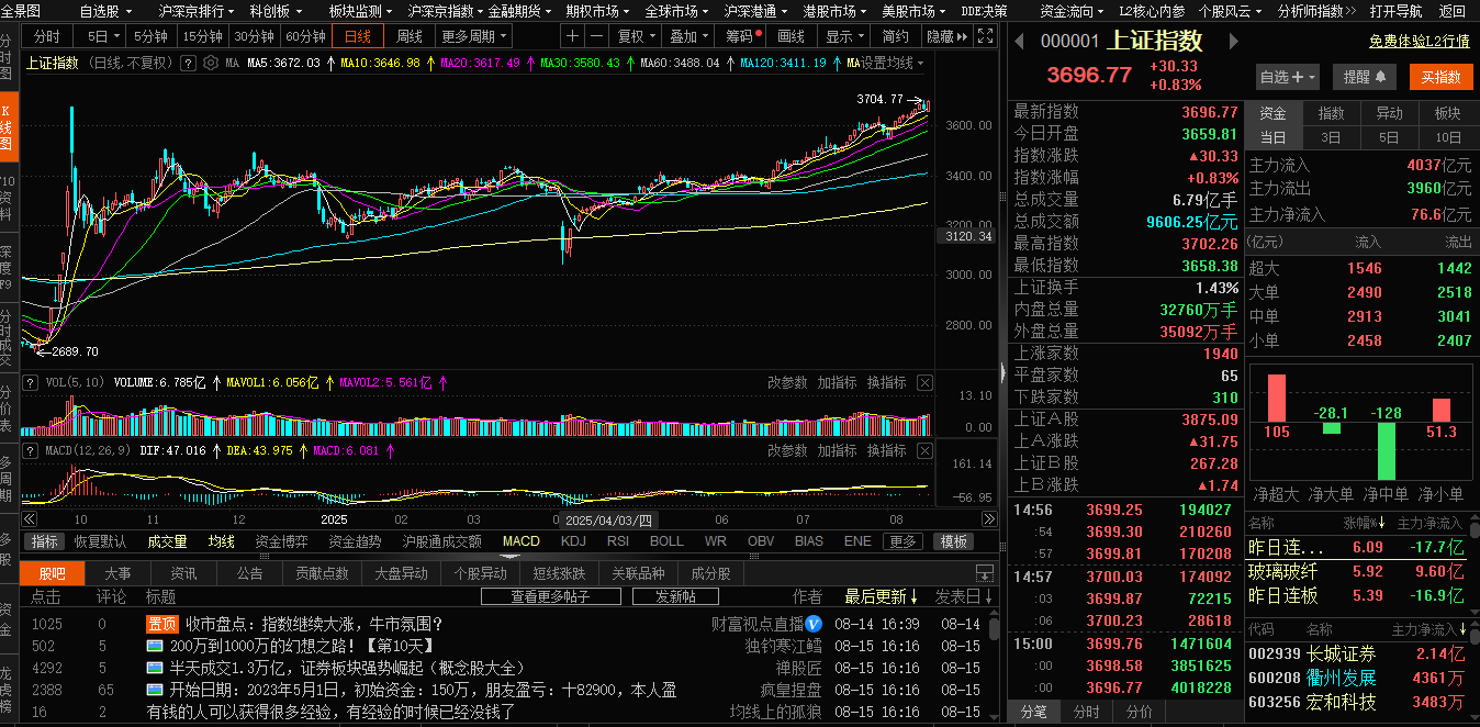 银行板块调整,压指数,大盘窄幅震荡,盘面回到了复 盘(8月13日)分析中的预期节奏,个股补涨全面有序展开,创业板个股涨比达到了约10:1的情形,很精彩。按我们的预期,这样的节奏预计至少会持续到下周三附近,这期间预计很多低位股会拉出大阳线,按既定策略,到下周后半段,仓位建议收拢至半仓附近。这是四月初看多做多以来第一次建议做些休整,反省下不足,总结下经验,然后继续前行。回头再看看咱们五月初的文章A股将成为全球股市中最美的那朵花,一路走来,创业板轻舟已过已五六百点。无它,周末愉快。 今日盘前传来两个好消息,一是中美高层将进行经贸会谈,二是降准、降息,这两个都属于重磅利好,由于这两个消息都是今天早上才有的,昨日咱们公众号分析文章《美元已进入贬值通道,A股牛市行情不可阻挡》对此无法提前预知,所以对今日盘面一些细节需要再做些分析。 依据昨日文章分析,今日大盘很可能会是小幅低开或小幅高开的中阳线,这种走势是最符合量价结构的市场本身自然走势,但今日大盘受利好影响,直接高开在3326点上市,仅就短线走势类型来说这不是一个很好的选择。 今日大盘高开幅度不算很大,但直接高开在上图中的粉色线柱区域,这是大盘的密集套牢区域,很多机构投资者、量化资金、游资、散户四月初因特朗普关税战被套于此,所以今天这么一高开,很容易受到空方反噬,这其实也是昨日文章之中分析过的为什么要等大盘反弹至3326点附近考虑减仓的原因。 我们再来看看四月份公众号文章一直沿用的大盘反弹推演图: 四月份的时候,咱们反复推演过盘面反弹走势,认为3326点区域很可能会是大盘本轮反弹的阶段性高点,原因就是这位置套牢压力是非常大的,所以今天即便有如此超级利好,大盘也仅仅只是微涨,并未出现大涨的景象,主要原因就是需要化解这个区域的压力。 如何看待今天的走势能?首先,大盘完成了本轮反弹的最低目标3326点、创业板也完成了最小反弹目标2000点,四月份大盘主跌区域已经被彻底收复,多方完胜。那一些朋友们的担忧来自哪里呢? 担忧主要来自于未知,不清楚大盘未来会怎么走,担心明天或短线大盘会出现大跌,这个担心是完全没必要的,大盘近期都很难出现大跌,从分时盘口来看,今日虽然成交量比较大,大盘收盘形态也不是很好,看似要大跌的样子,其实是吓人用的,今日盘面应该是洗盘!预计明日个股整体表现仍然会非常精彩,短线会非常适合操作。 而且由于这种高开震荡洗盘方式,效果应该是比较好的,节省了很多调整时间,而且调整的空间也会相应变小,预计大盘可能3280-3360点略作震荡,然后继续向上冲击3500点区域,创业板也要回补4月初的跳空缺口,就操作来说,大盘将迎来很舒服的一段操作时间。 你以为A股是那样,你以为A股永远会是那样,但是这次你错了, A股将变得让你难以想象,坏的总能变得好,弱的终会变得壮,谁能想到丑陋的一个蛹,却变成了翩翩起舞的蝴蝶模样 A股牛市的已经启动,这次是天时地利人和的必然结果,牛市征途将像钢铁洪流般碾压一切、不可阻挡,沉寂数年的A股将成为未来五年全球股市中最美的那一朵花,对此一定要有信心,还是那句话,有些事,要么深信,要么不信,信一半最痛苦。 |
