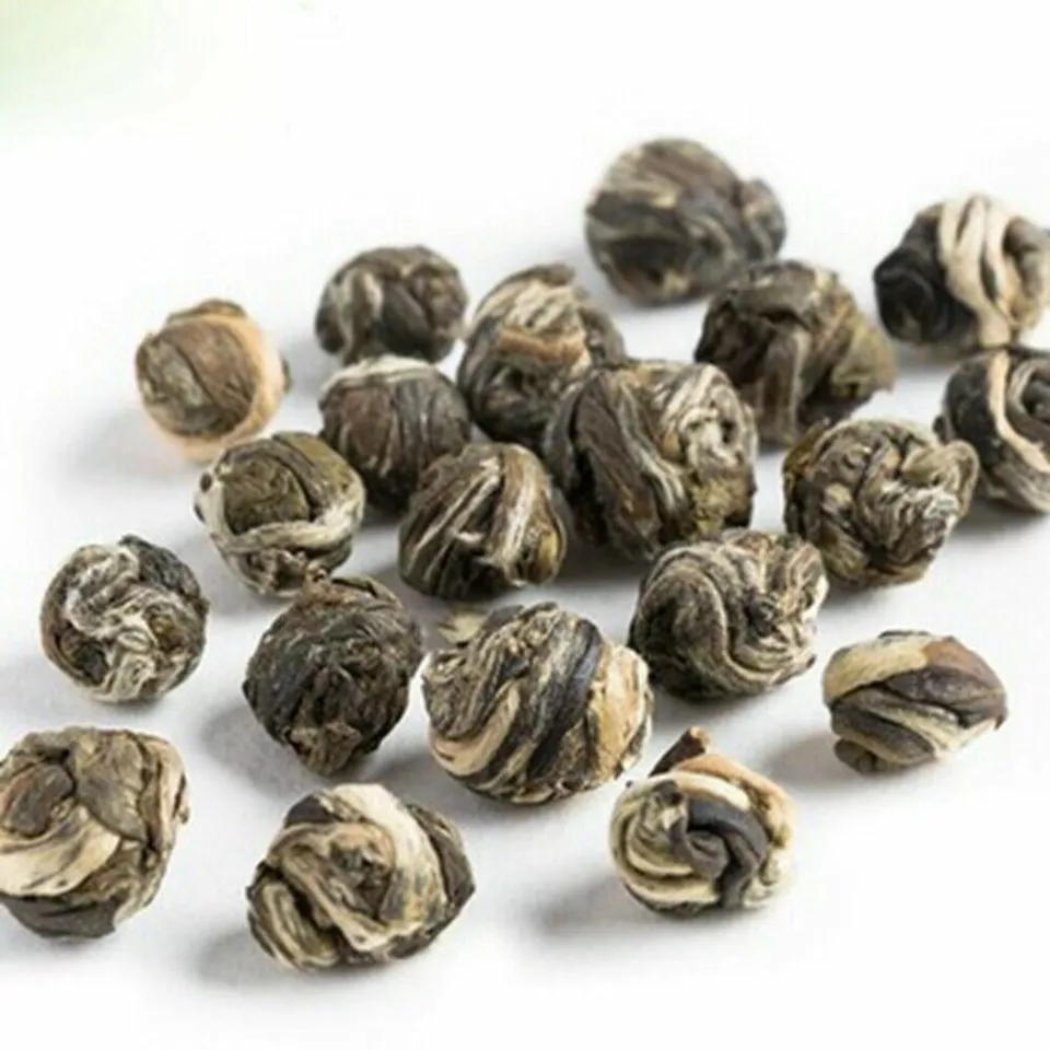 The most popular of all scented teas, Pearl jasmine are created by rolling specially plucked long downy shoots into little silvery "pearls" which are naturally scented multiple times with fresh, aromatic jasmine flowers. Pearl jasmine tea is named after the pearl like shape of the tea. Each small pearl is hand rolled. The tea is made by laying fresh jasmine petals atop the tea leaves, then tea leaves atop more petals, and so on. Up to six layers of blossoms alternating with tea leaves are used to create the highest- quality jasmines, using flowers picked at their aromatic peak. When the jasmine scent is fully merged with the leaves, the petals are removed, and the tea carefully dried again. Each pearl blosoms when added to water. This stunning tea has an intense flavour and the beautiful aroma of jasmine.